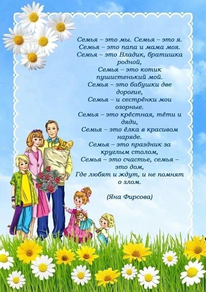 Слова "семья" и "любовь" несут в себе о.громный смысл Неудивительно, что самые нежные и тёплые воспоминания каждого человека связаны именно с ними. Ежегодно 8 июля в России празднуется День семьи, любви и верности. Этот праздник появился благодаря Муромскому князю Петру и его жене Февронии, которые жили в ХIII веке, они считались на Руси покровителями семьи и брака. Семья - это одна из главных ценностей человечества. Семья - это дом. Семья - это мир, где царят любовь и преданность. Это радость и печали, которые одни на всех. Это привычки и традиции. Это крепость, за стенами которой могут царить лишь покой и любовь. Семья - основа отношений, которая начинается для ребенка с мамы и папы, это слово напоминает о ласковом голосе мамы, о заботливой строгости отца. Это незаменимый источник поддержки и опоры. Счастье и надежда каждой семьи - это дети. Обязанность родителей - достойно воспитать своих детей, передать им свой жизненный опыт, семейные ценности.