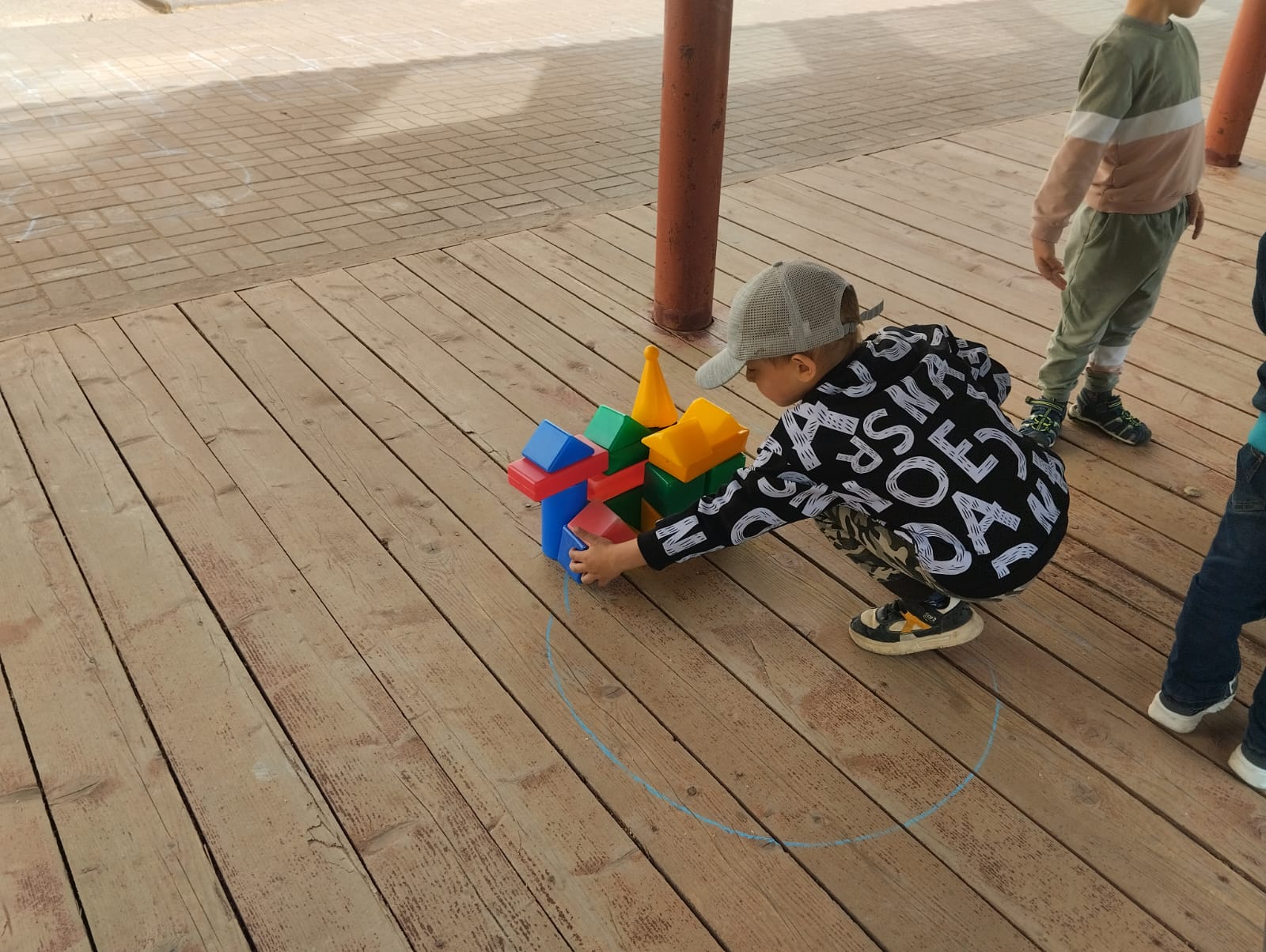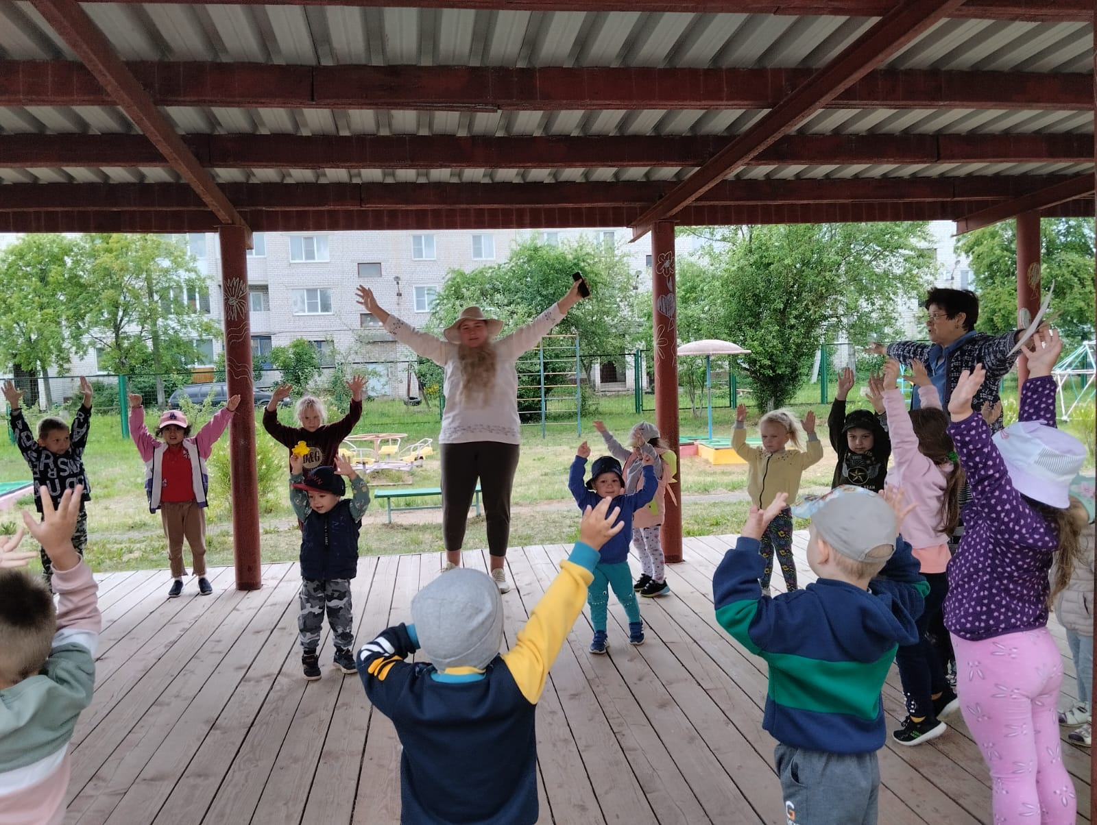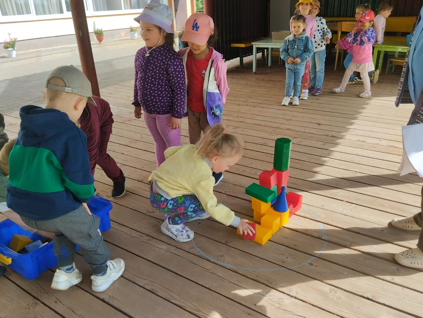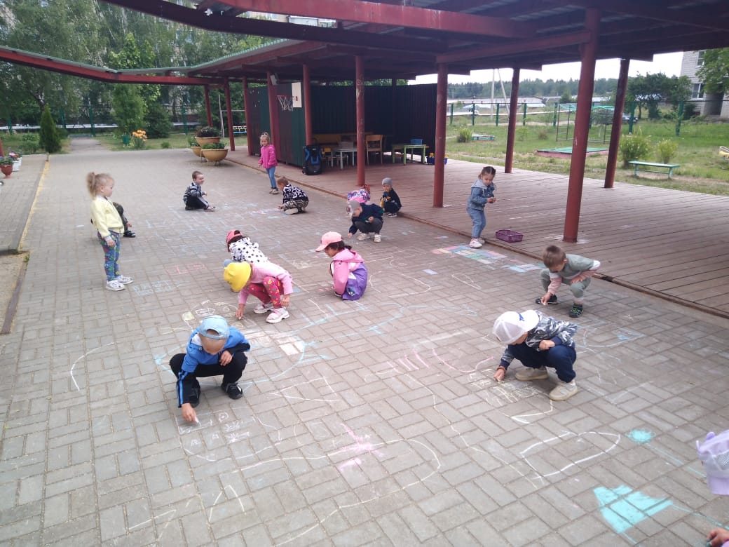 Педагоги подготовили несколько локаций с подвижными играми: "Городки", "Веселая змейка", "Занимательные фигуры". Любители творчества и рисования проявили свои таланты на асфальте. Вместе с воспитателями танцевали.