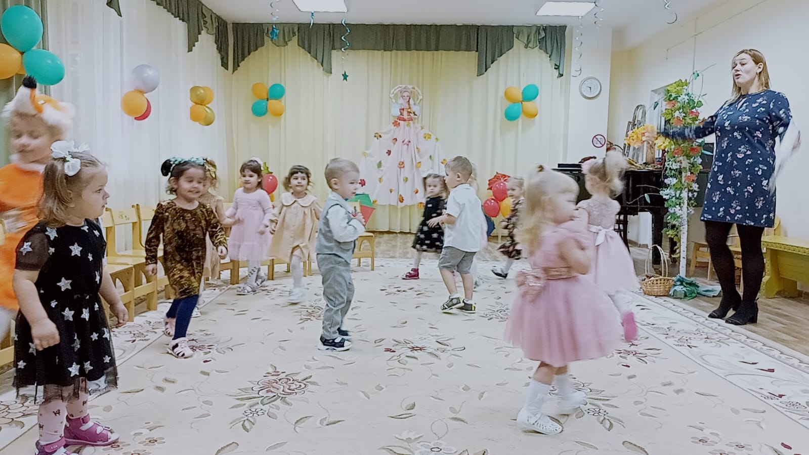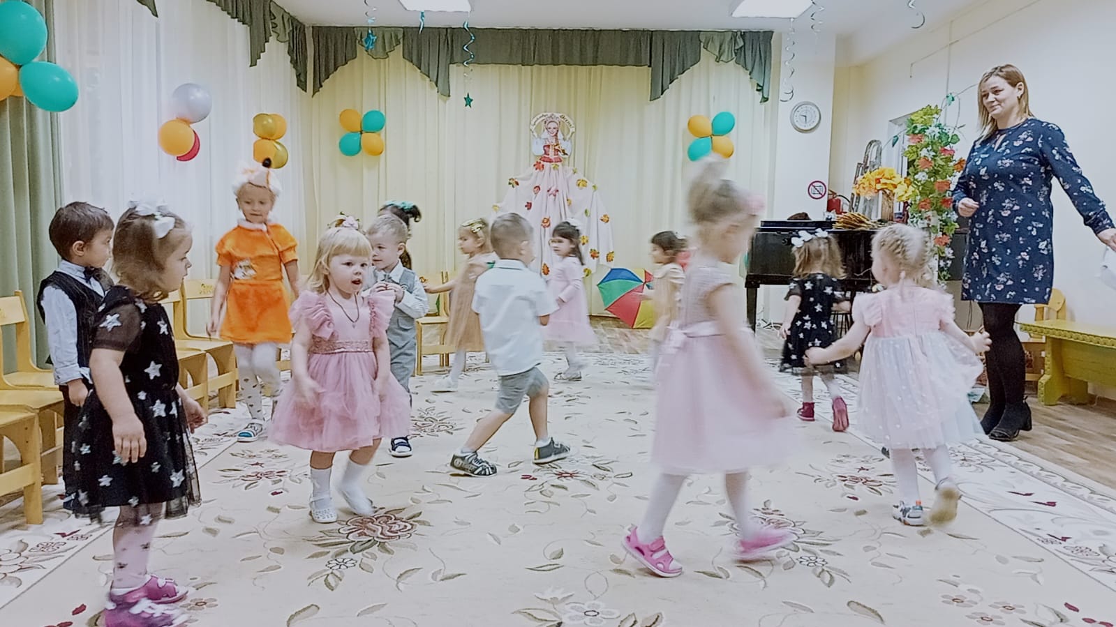 Цель данных мероприятий – формирование представлений и знаний у детей о временах года, об осени, умений отражать свои знания в музыкально-игровой деятельности, а также гармонизация детско-родительских отношений посредством совместной досуговой деятельности. При этом решались воспитательные, развивающие и образовательные задачи: воспитывать у детей любовь к родному краю, его природе, чувство восхищения красотой осенней природы; развивать речь, мышление, воображение, память, любознательность, познавательный интерес, творческие способности; расширять и обобщать знания детей об осеннем времени года, осенних изменениях в неживой и живой природе; учить с детьми стихотворения, песни, танцы по осенней тематике.
