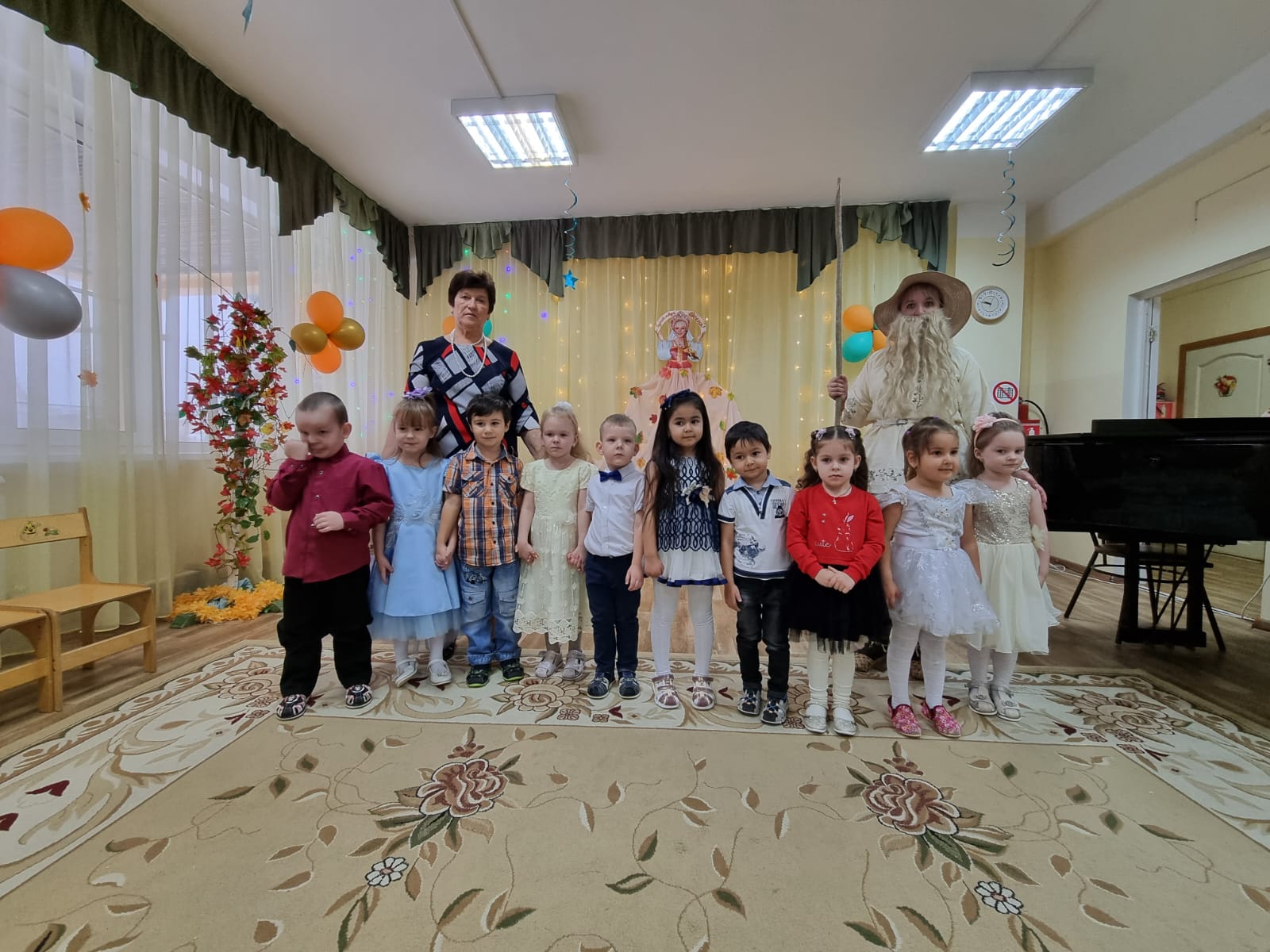 Юные артисты порадовали Золотую Осень (роль исполняла младший воспитатель Лебедева Ю.Н., в подготовительной группе - воспитатель Иванова Е.В.) и зрителей восхитительными осенними стихами, песнями, танцами, хороводами. В гости к ребятам приходили дедушка Листовичок (роль исполняла воспитатель Иванова Е.В.), бабушка Мухомор (роль исполняла младший воспитатель Иванова Ю.О.), которые играли, танцевали и веселились с детьми. Юные актёры разыграли весёлые сценки. Хоровод разноцветных осенних листьев кружил в украшенном зале под чудесные мелодии осеннего леса. Лица детей и взрослых сияли улыбками. Хотелось, чтобы праздник не заканчивался. Но, увы, у Золотой Осени осталось ещё очень много дел на улицах, в лесах и полях: и растениям, и животным, и людям надо помочь подготовиться к зиме. В следующем году гостья обещала опять навестить ребят, а пока не придёт белоснежная зима, будет радовать наш взор своими яркими красками!