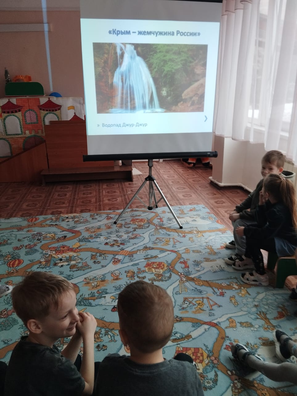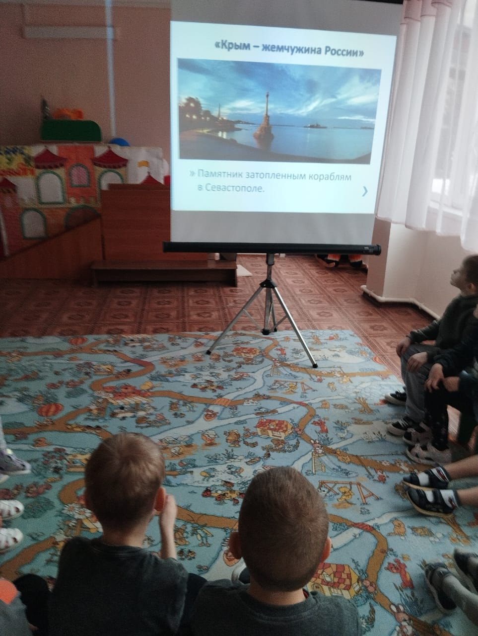 Ребята с интересом слушали рассказы воспитателя об истории Крыма, о достопримечательностях и природе полуострова. В виртуальных экскурсиях "Путешествие по истории", "Крым – это Россия" дети знакомились с символикой Крыма и России, изучали флаг и герб, слушали гимн Российской Федерации и Крыма.