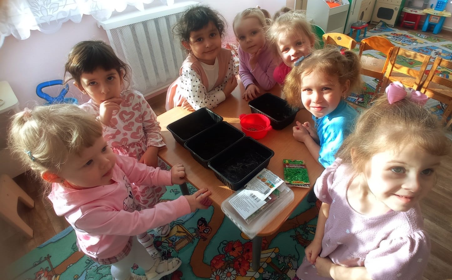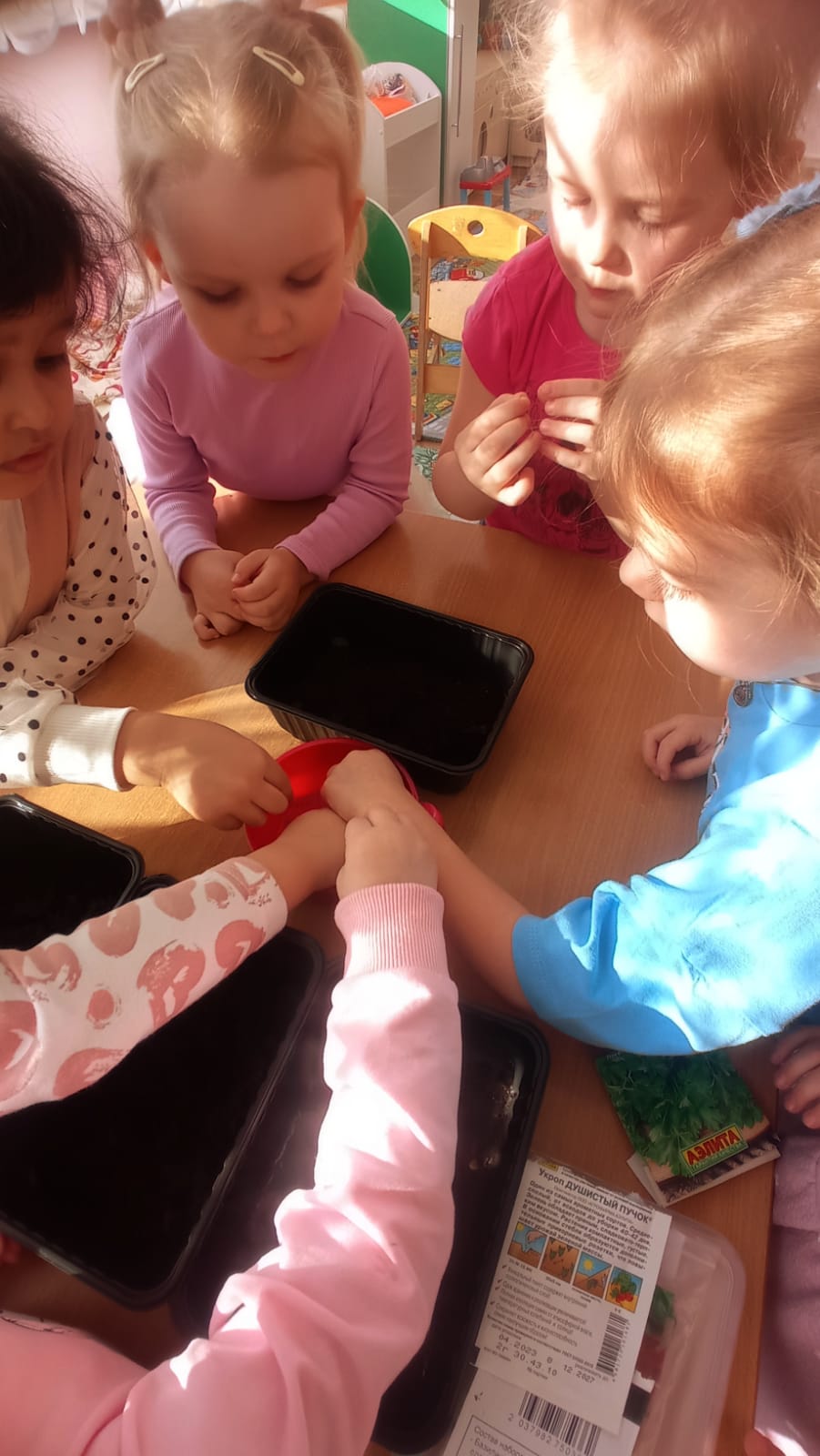 Воспитанники младшей группы под руководством воспитателя Морозовой В.В. приступили к посадке семян будущей рассады.