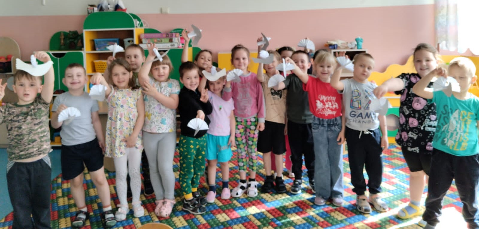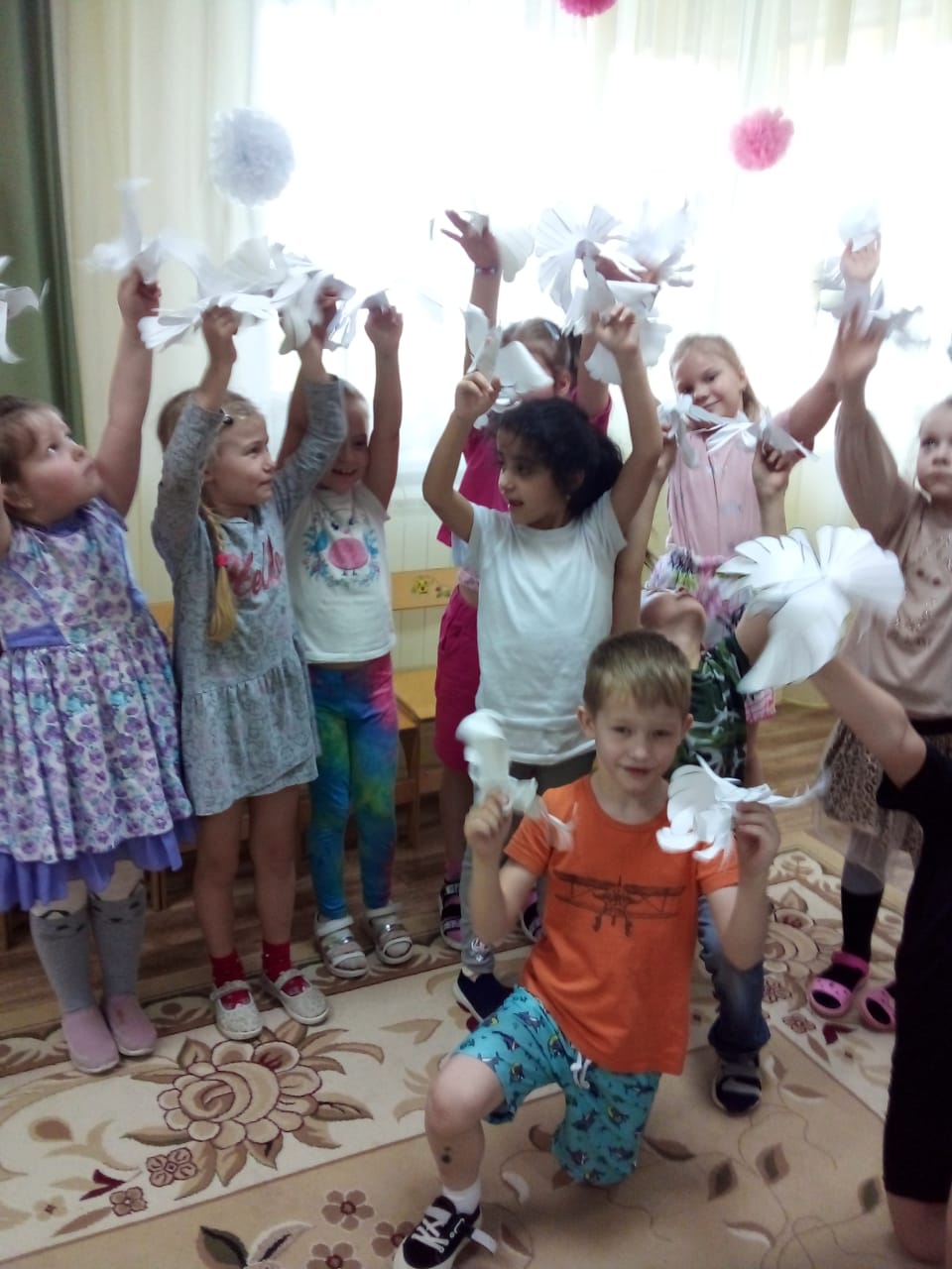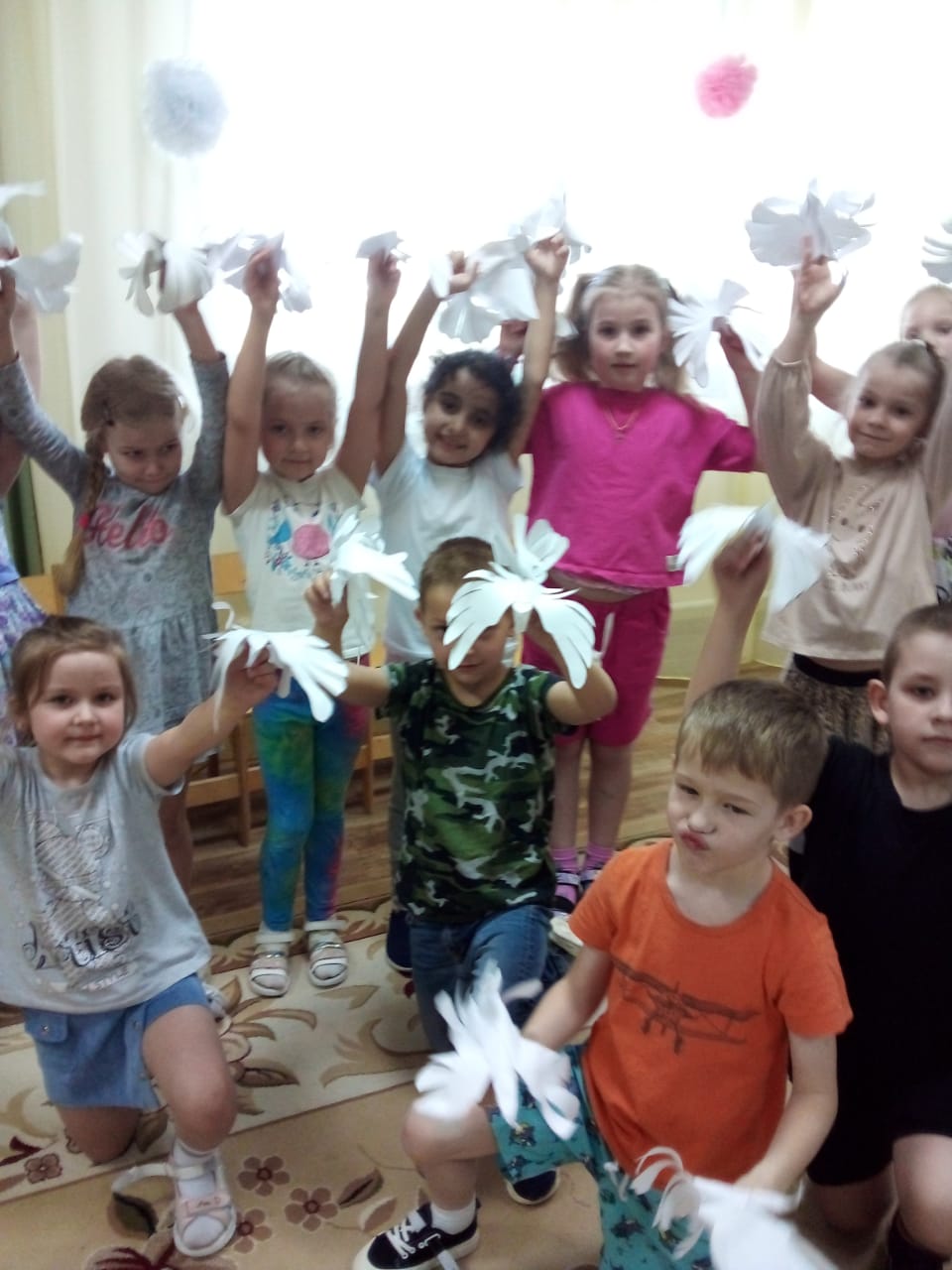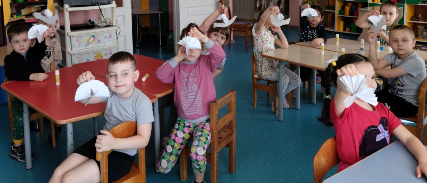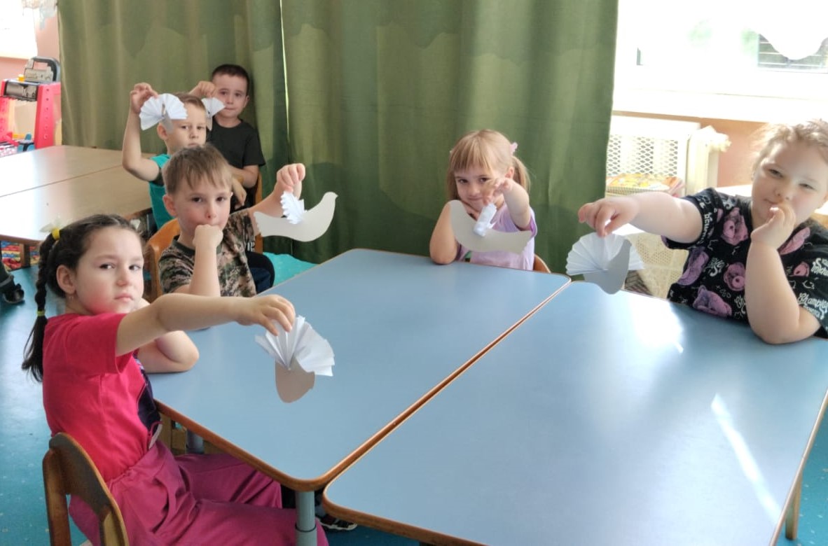 Ребята старшей и подготовительной группы под руководством воспитателей на занятиях изготовили символ мира — белых голубей в технике объемной композиции. У каждого воспитанника получился свой голубь, который, несомненно, станет атрибутом приближающегося праздника.