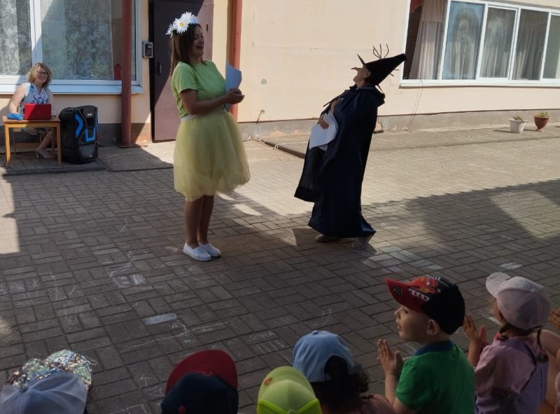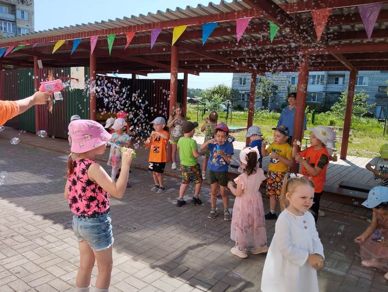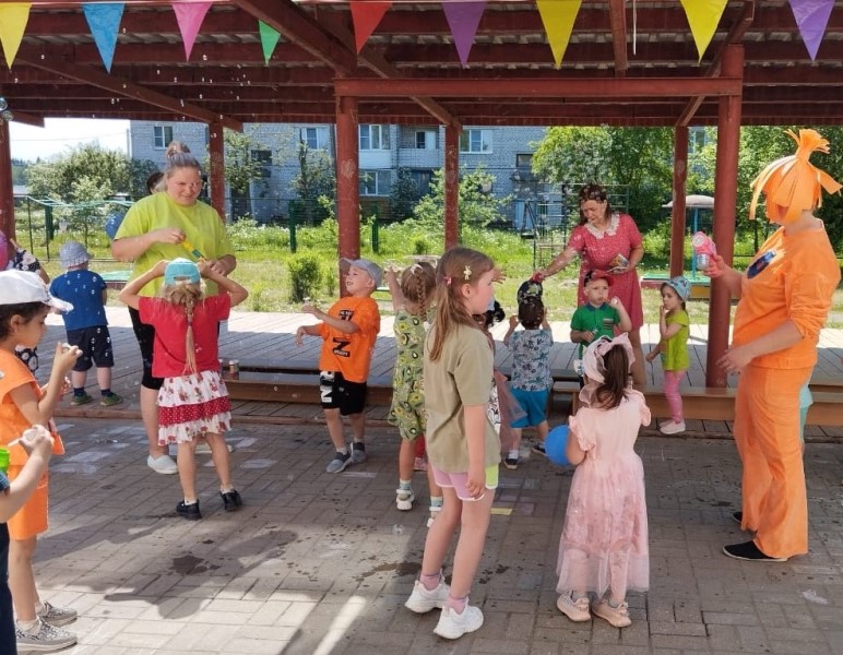 Радостно, звонко, тепло и красочно встретили мы этот праздник в нашем детском саду. Все педагоги старались сделать так, чтобы этот праздник надолго запомнился детям, создали праздничную атмосферу, украсили территорию детского сада, звучала весёлая музыка, создавая весёлое настроение у детей. Ребята принимали активное участие в веселых эстафетах, удивляли красотой танцев, читали стихи и пели песни. В гостях у ребят были забавная злюка-барабука (роль исполнила младший воспитатель Иванова Ю.О.), лето (роль исполнила воспитатель Морозова В.В.), фиксик (роль исполнила воспитатель Иванова Е.В.). Воспитанники вместе с гостями участвовали в играх, читали стихи про безоблачное детство, пели песни о дружбе, танцевали. Закончился праздник зажигательной, поднявшей настроение дискотекой с мыльными пузырями!